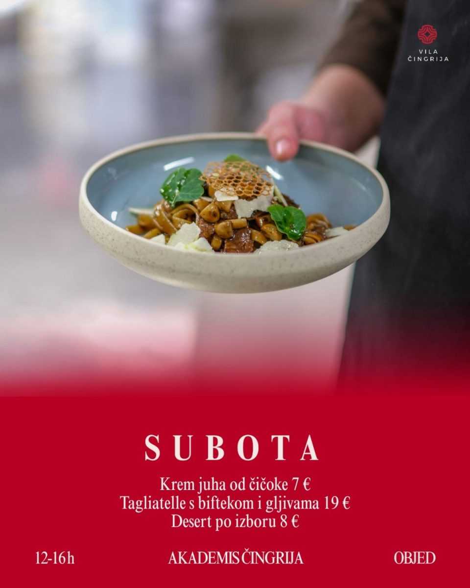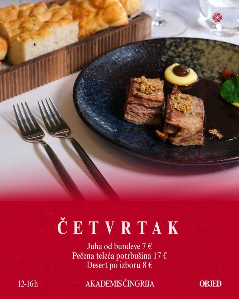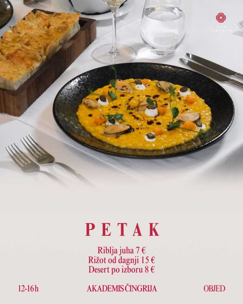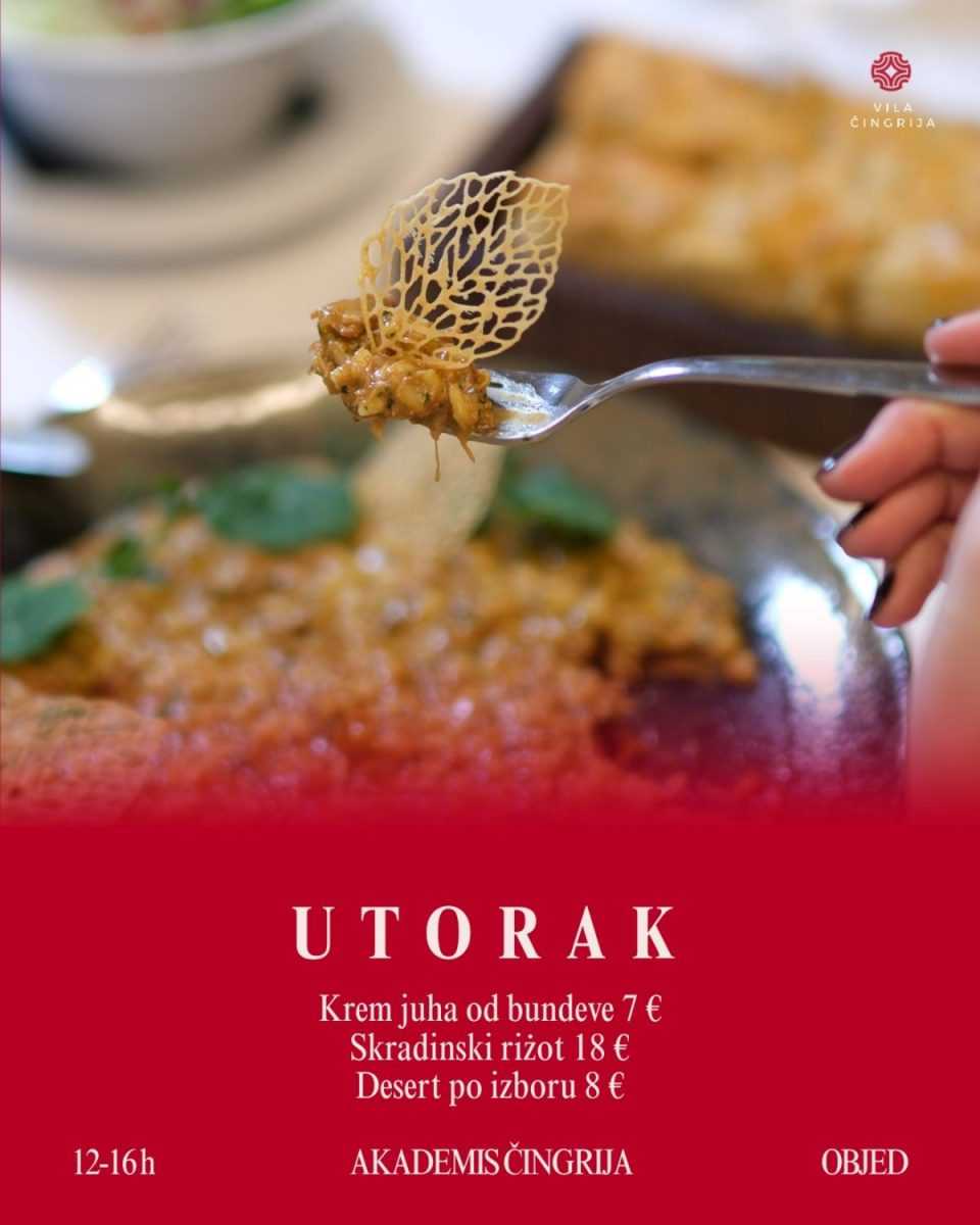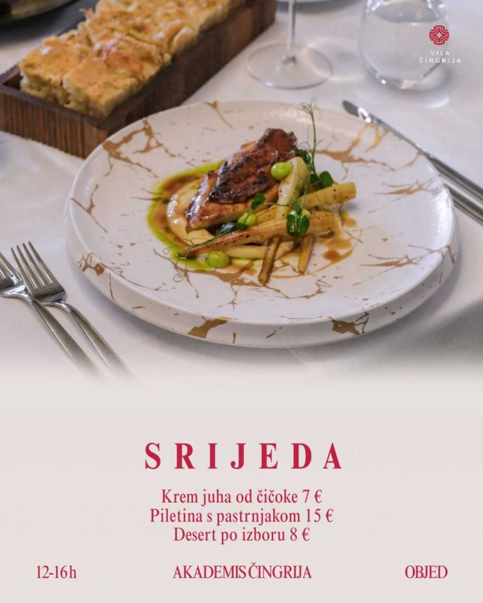 Akademis Čingrija od utorka do subote, od 12 do 16 sati, poslužuje posebno osmišljene dnevne objede kroz petodnevni jelovnik dostupan isključivo u tom terminu. Riječ je o konceptu koji spaja konkretan rad, ozbiljnu kuhinju i ambijent koji cijelom iskustvu daje dodatnu vrijednost.