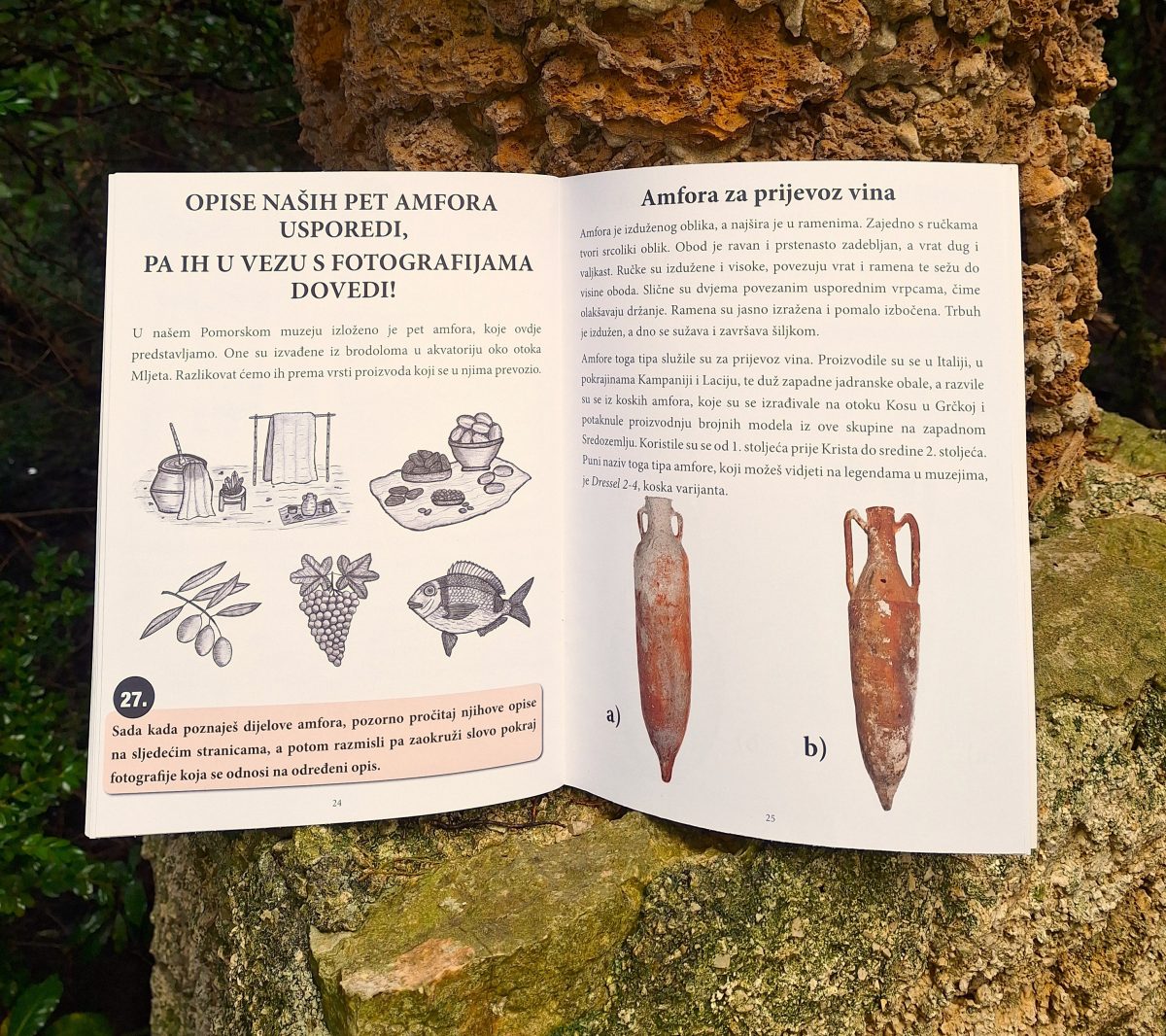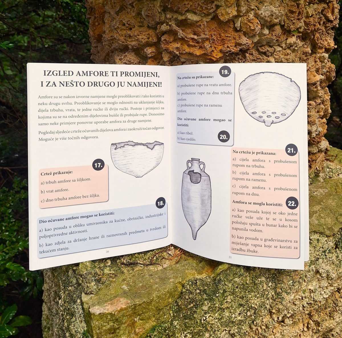 Ova interaktivna publikacija osmišljena je kao vodič kroz svijet antičkih keramičkih posuda, koje su stoljećima služile za transport vina, ulja i drugih proizvoda. Kroz zanimljive zadatke i ilustracije čitatelji mogu saznati što su amfore, kako su nastale, kakvi su njihovi tipovi te što otkrivaju o svakodnevnom životu i pomorskoj trgovini u prošlim vremenima. Cilj publikacije približiti povijest i arheologiju mlađim generacijama te razviti zanimanje za muzejske zbirke i kulturnu baštinu Dubrovačkog područja.