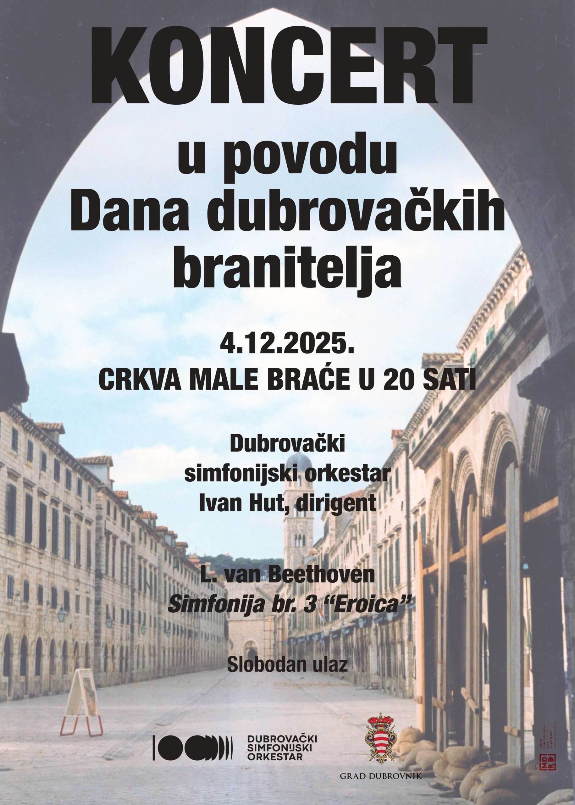 Orkestrom će ravnati maestro Ivan Hut, a na programu je Beethovenova Simfonija br. 3 „Eroica“. Uz ovaj tradicionalni koncert prisjećamo se teških dana dubrovačke povijesti i herojske obrane Grada. Također, prisjećaju se prvog koncerta klasične glazbe održanog u ratnom Dubrovniku 5. prosinca 1991. u Umjetničkoj školi Luke Sorkočevića, kada je svijet obilježavao 200. obljetnicu Mozartove smrti, a Dubrovnik se pridružio, pod ravnanjem maestra Iva Dražinića, uz gitarski duo Ante Skaramuca-Frano Matušić i Frana Krasovca na klaviru, dok je slikar Josip Škerlj priredio izložbu.