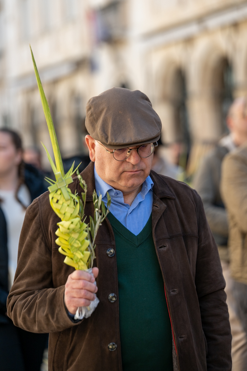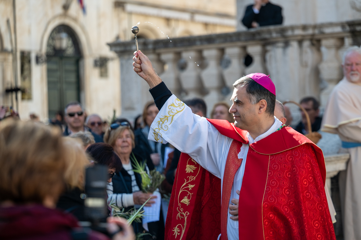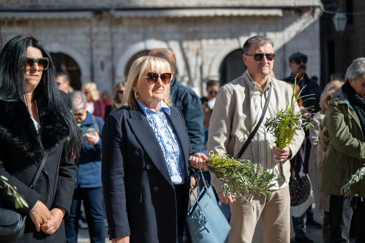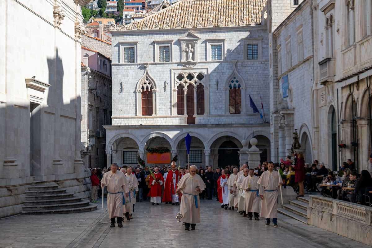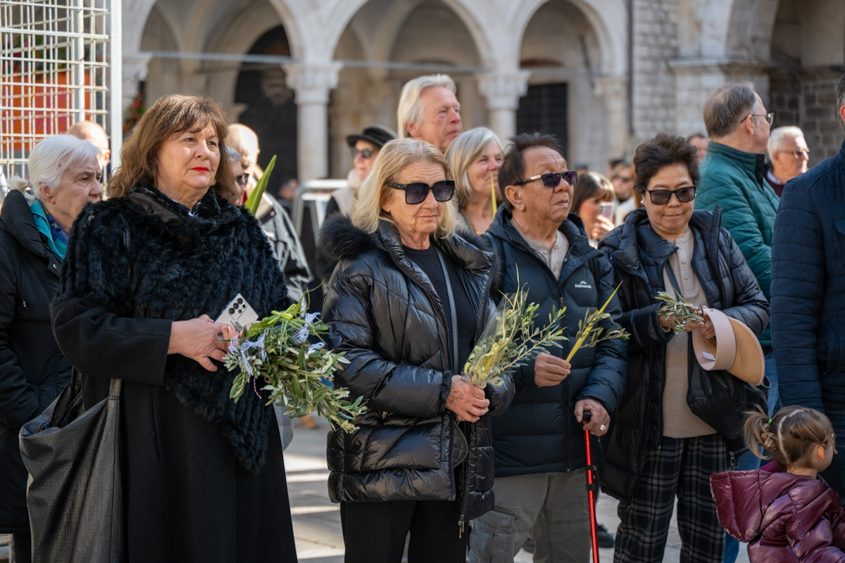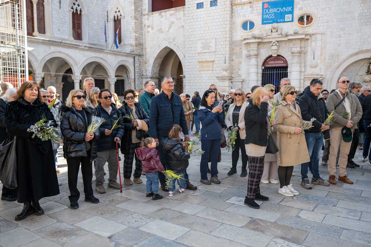 Dubrovački biskup Roko Glasnović predvodio je obred blagoslova maslinovih i palminih grančica ispred zborne crkve sv. Vlaha.