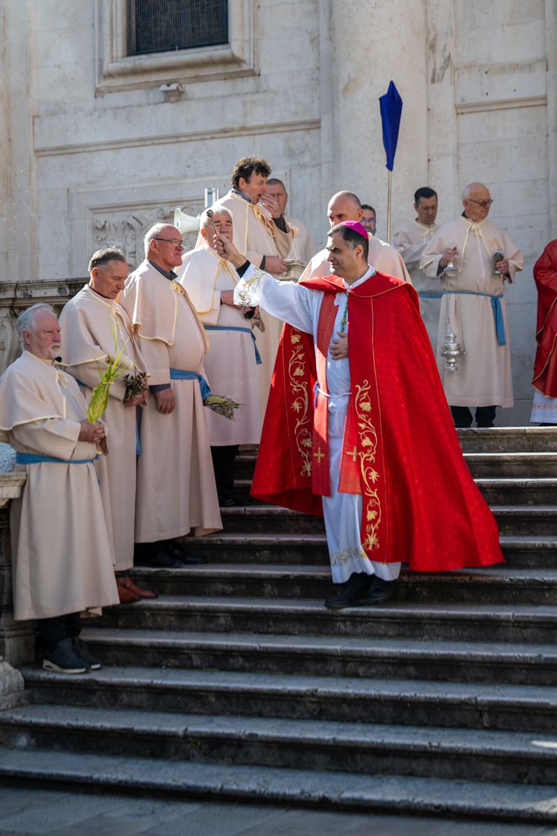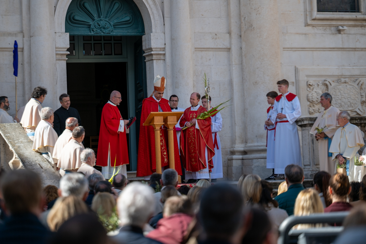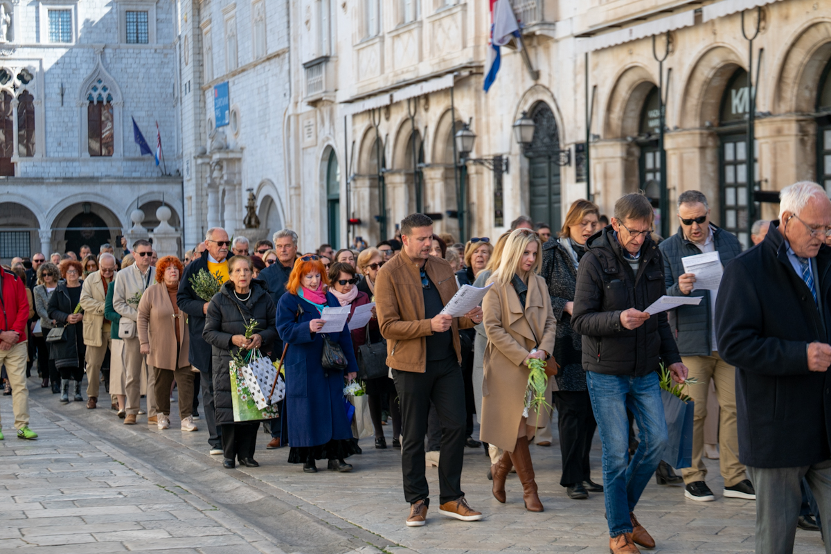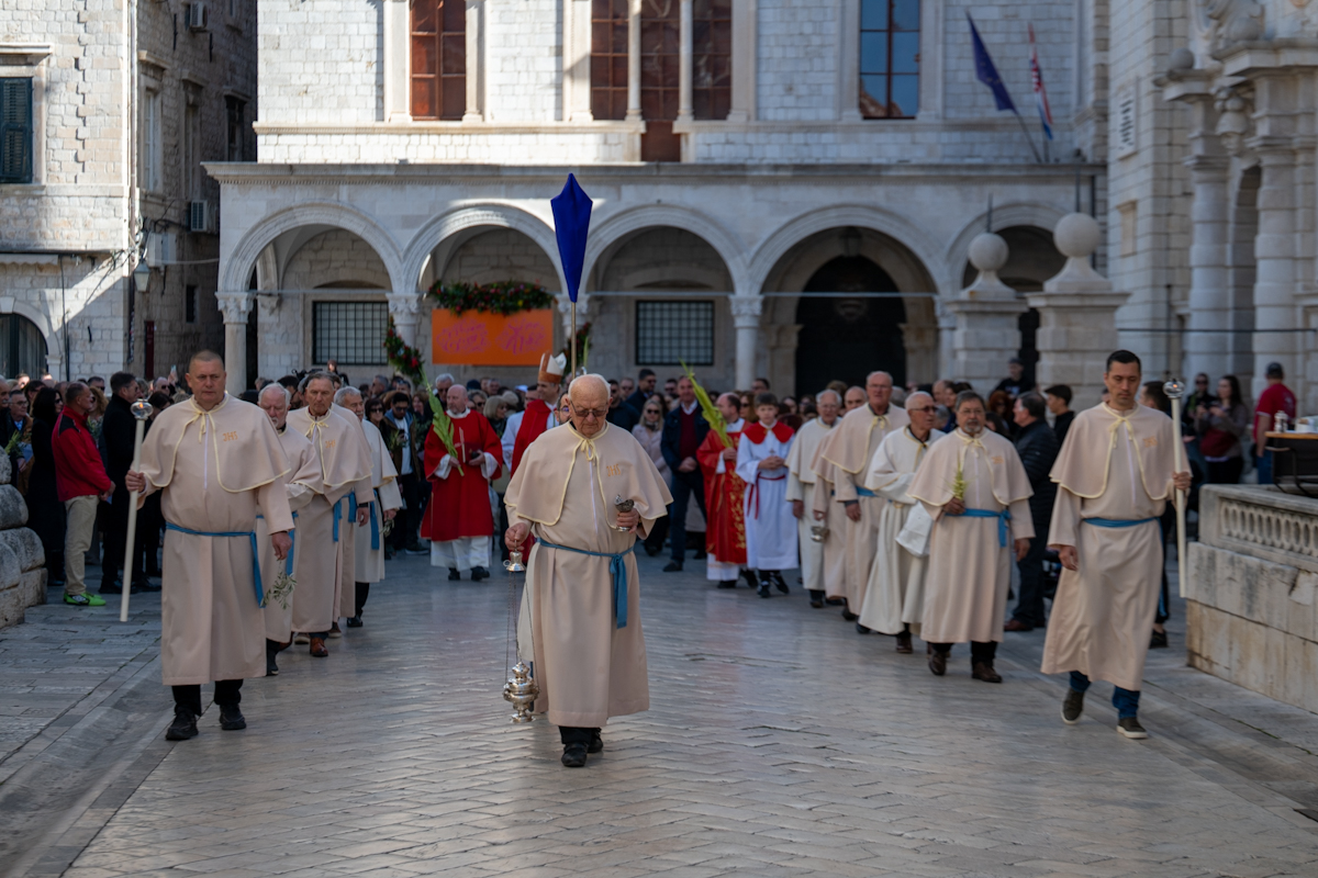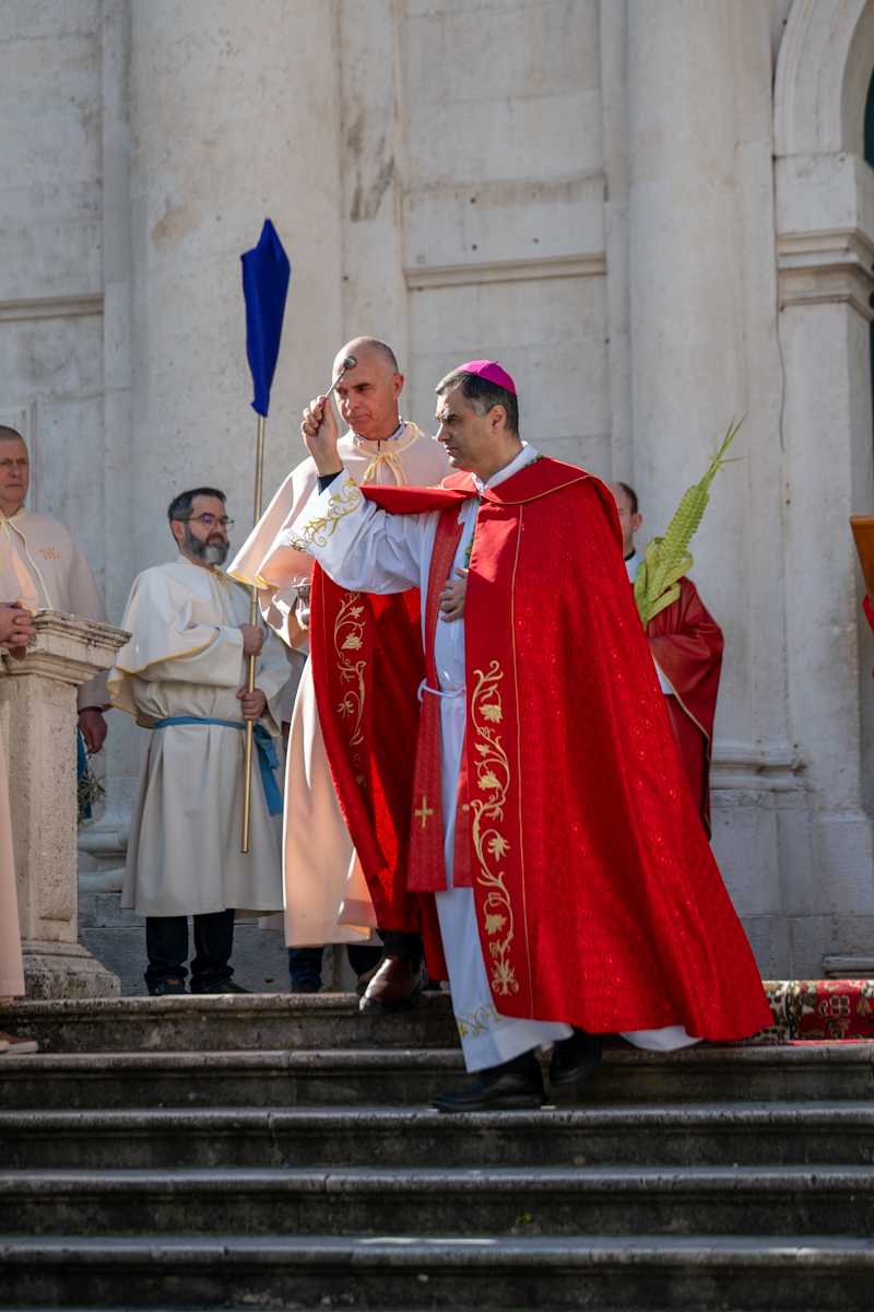 Dubrovački biskup Roko Glasnović predvodio je obred blagoslova maslinovih i palminih grančica ispred zborne crkve sv. Vlaha.
