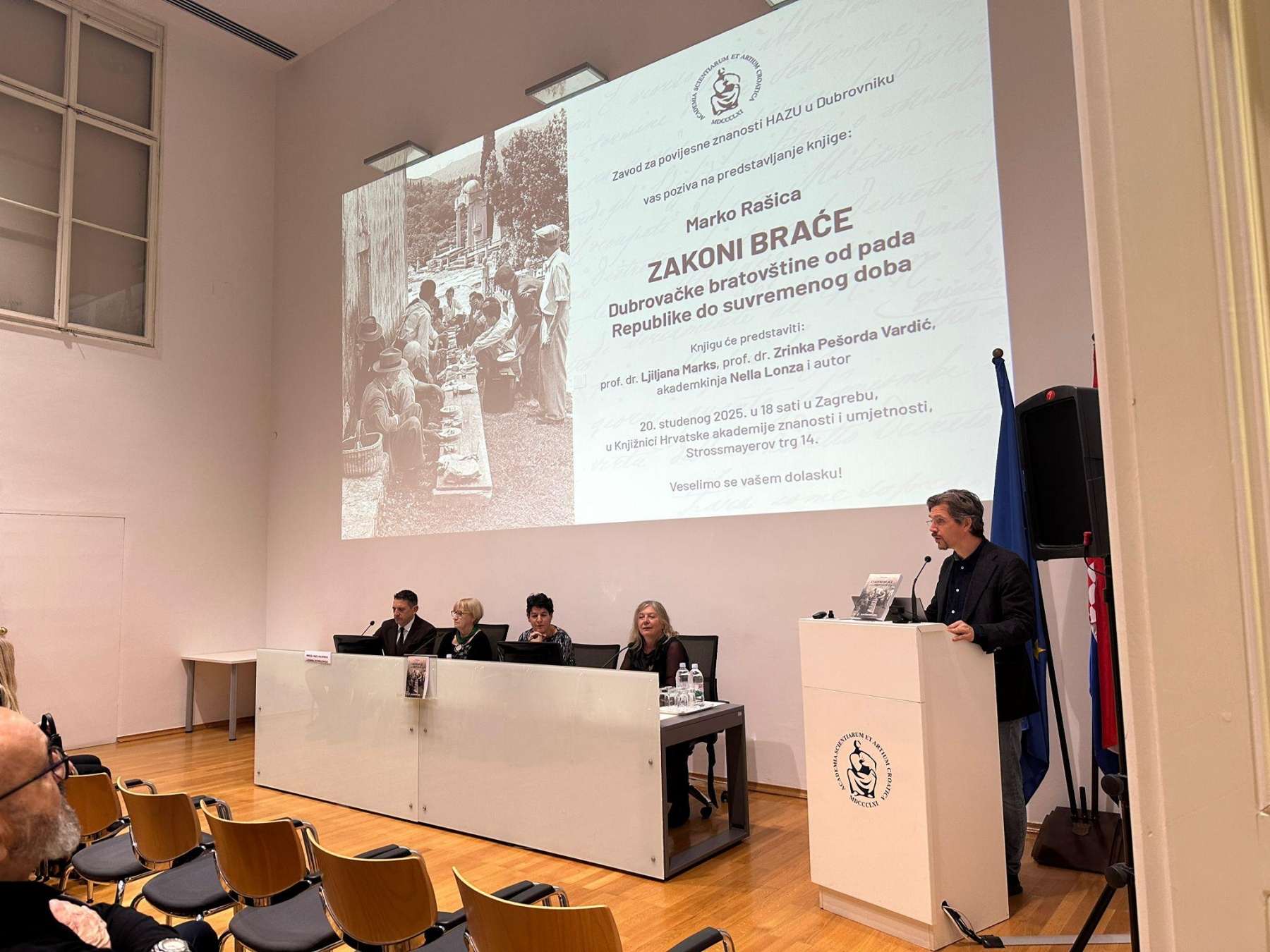 Nakon dubrovačke promocije održane 23. travnja ove godine, ‘Zakoni Braće’, knjiga dr. sc. Marka Rašice predstavljena je danas u Zagrebu. Unatoč lošem vremenu knjižnica Hrvatske akademije znanosti i umjetnosti bila je popunjena do posljednjeg mjesta.
