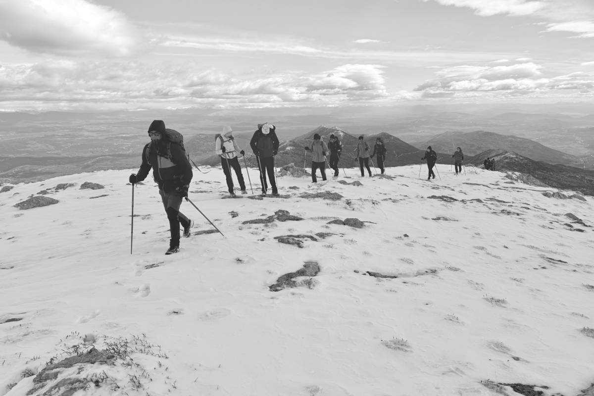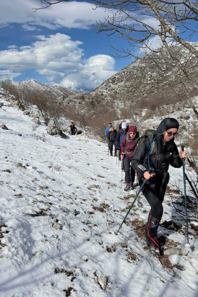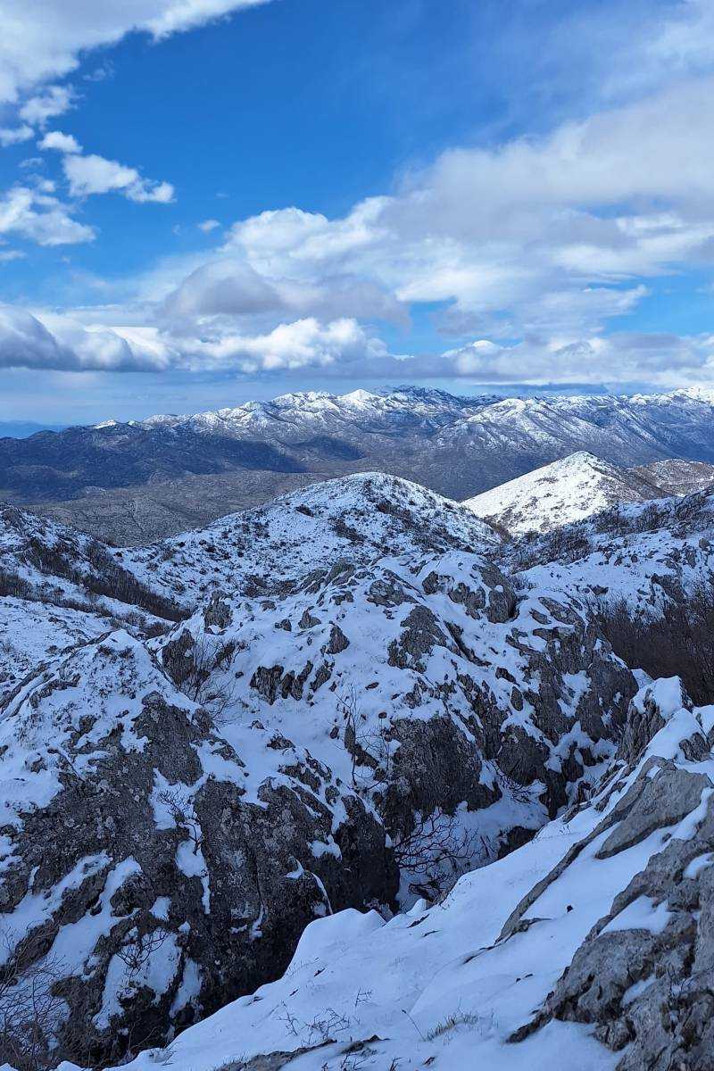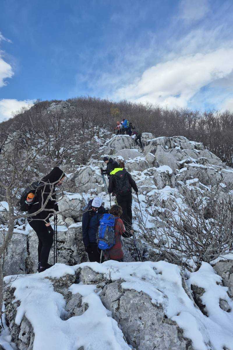 Po Nikolinom prijedlogu krenuli smo na 6,4 kilometra dugu kružnu turu do vrha. Nakon pola sata uspona staza dobiva snježnu podlogu, a nakon još pola sata izlazimo na greben gdje nas počinje ozbiljno šamarati jaka bura. Toliko da smo na trenutke morali stati i štapovima se ukupati na mjestu da na vjetar ne bi poravnao sa stazom. Idemo dalje i teren postaje sve stjenovitiji. Između stijena dosta je škrapa, a kako ima snijega koji ih pokriva, kretanje je usporeno. Na poprilično mjesta se penjemo i služimo i rukama. Staza je markirana, ali su markacije uglavnom na kamenju na tlu. Tako da snijeg pokriva većinu njih. Ipak dolazimo na vrh po snježnom pokrivaču od nekih 5-10 centimetara. Bura toliko jako puše da smo se na vrhu zadržali tek toliko da pogledamo prema Neretvi, Pelješcu, Biokovu i Hercegovini te napravimo nekoliko fotografija. Nastavljamo dalje. Snijega na južnoj strani Velikog Šibenika ima dvostruko. Markacija nema odnosno pod snijegom su. A mi smo svi tu prvi put. Odlična je to bila prilika za pokazati i sebi i školarcima kako se snaći u takvim situacijama. I malo po malo- otkrili smo stazu. Nakon izlaska s grebena na južnu padinu planine snijega je bilo sve manje. Nakon spuštanja i prve pauze- snijega je bilo tek u tragovima, a staza se otvarala pred nama. Vjetra gotovo da i nije bilo, a sunce nas je počelo grijati. Oblaci koji su ga zaklanjali razišli su se. Spuštajući se gledali smo prema Matokitu i Svetom Mihovilu. Za ovoga drugoga Nikola će nam po povratku u dom reći da je po ovako jakom vjetru uspon nemoguć.Tako da smo imali sreće s odabirom planine. Zanimljiva, teška i izazovna bila je ova kružna tura. No, nikome nije teško palo. Očito se noć ranije nakupilo dosta pozitivne energije i snage za uspon. Zajedništvo u planini ponovo se pokazalo dobitnom kombinacijom.