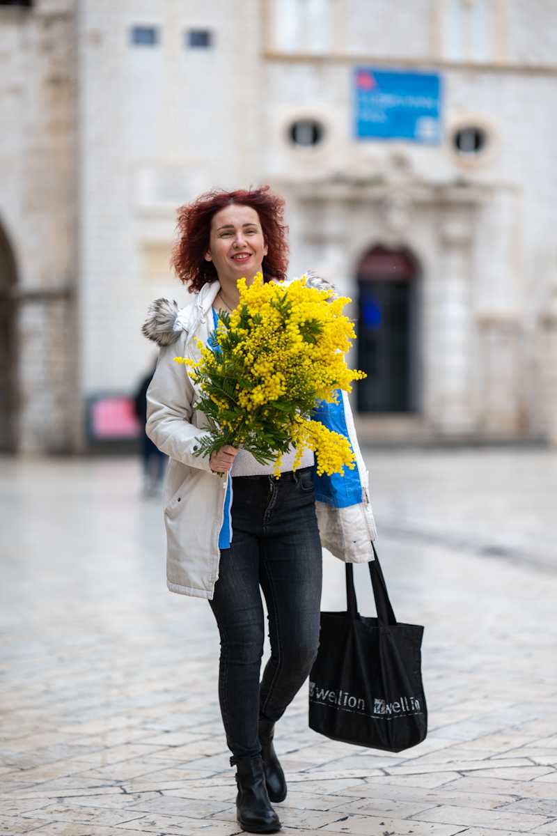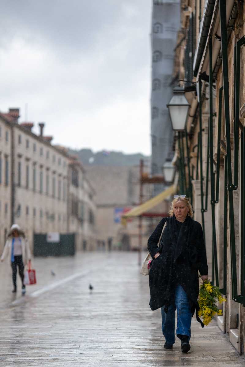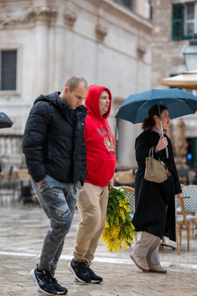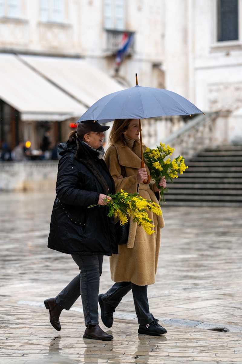 Što je nama malo kišice? Obrelom zaštiti glavu i u đir! Važno da ne puše prejako i da nije prehladno. I ima svoju posebnu draž Stradun kad se od kišice onako smočen presijava. A jutros ga je još ukrasila ona predivna žuta boja mimoza koje su brojni kupili sa humanim ciljem – pomoći onkološkim bolesnicima. Jer kao što znate i kako smo već pisali održavala se ispred Sponze humanitarna akcija posvećena borbi protiv raka vrata maternice. Pa su tako mnogi naši sugrađani, pa i pokoji turist, spojili ugodno s korisnim. Učinili su dobro djelo, a doma će odnijeti predivno cvijeće.
