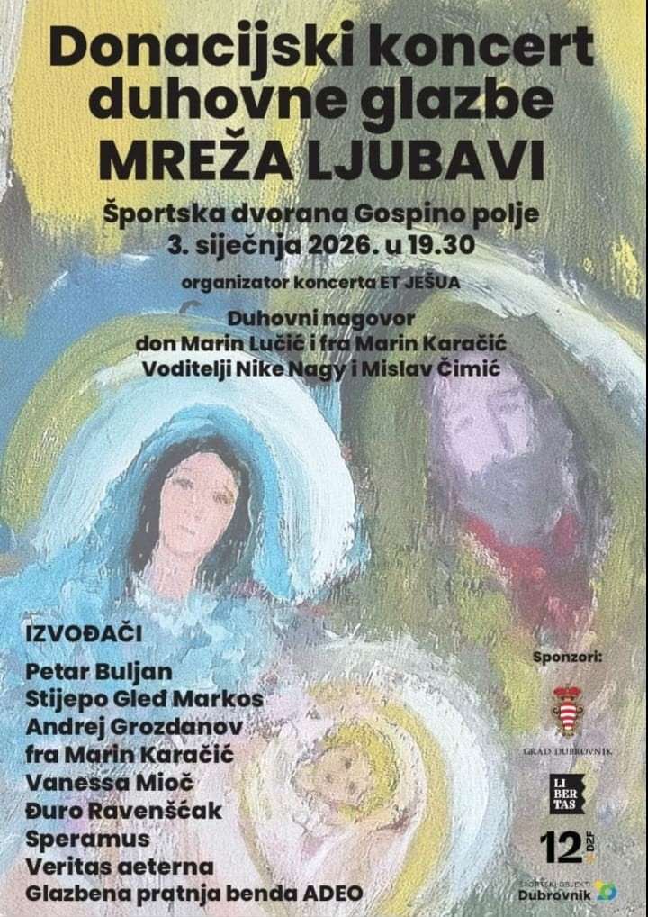 Donacijski koncert duhovne glazbe „Mreža ljubavi“ će se održati 3. siječnja 2026. u Sportskoj dvorani u Gospinom polju s početkom u 19:30 sati. Na pozornici će se okupiti poznata imena duhovne glazbene scene: Petar Buljan, Stijepo Gleđ Markos, Veritas Aeterna, Andrej Grozdanov, fra Marin Karačìć, Speramus, Vanessa Mioč i Đuro Ravenšćak uz glazbenu pratnju benda Adeo, koji će svojim glazbenim darom obogatiti ovu večer.